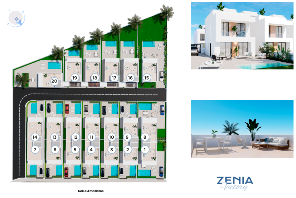 Urbanización privada con parcelas independientes y piscina privada.